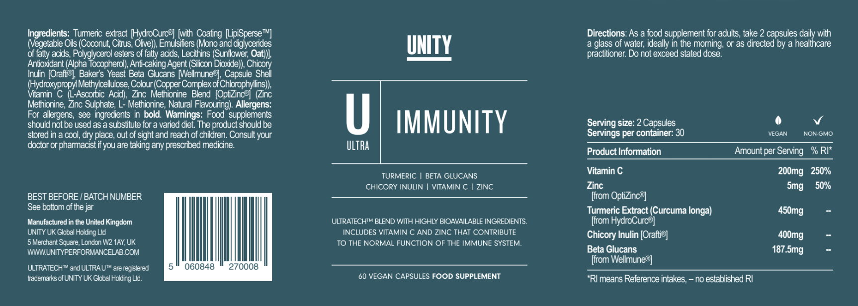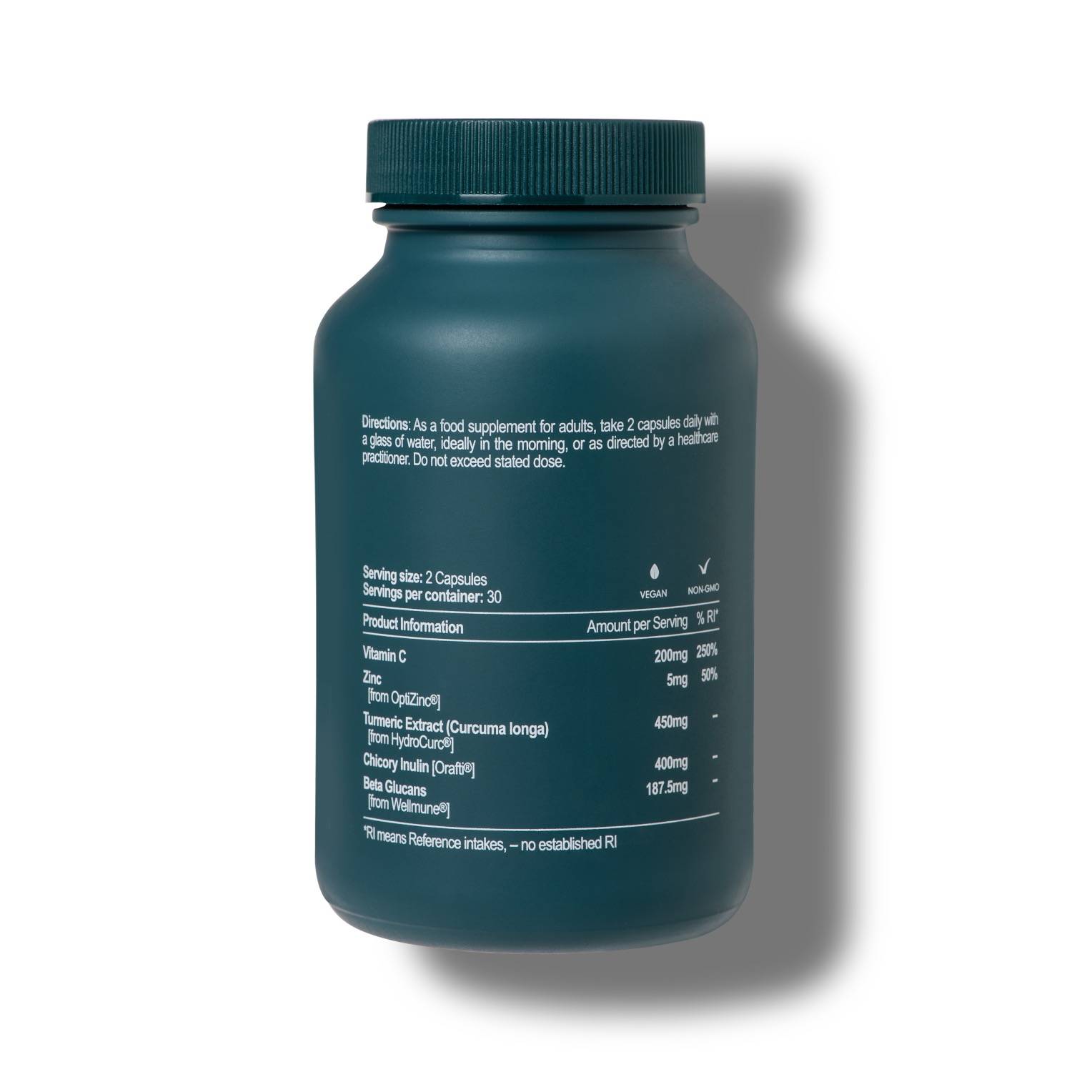 Ingredients: Turmeric extract [HydroCurc®] [with Coating [LipiSperse™] (Vegetable Oils (Coconut, Citrus, Olive)), Emulsifiers (Mono and diglycerides of fatty acids, Polyglycerol esters of fatty acids, Lecithins (Sunflower, Oat))], Antioxidant (Alpha Tocopherol), Anti-caking Agent (Silicon Dioxide)), Chicory Inulin [Orafti®], Baker’s Yeast Beta Glucans [Wellmune®], Capsule Shell (Hydroxypropyl Methylcellulose, Colour (Copper Complex of Chlorophyllins)), Vitamin C (L-Ascorbic Acid), Zinc Methionine Blend [OptiZinc®] (Zinc Methionine, Zinc Sulphate, L- Methionine, Natural Flavouring). Allergens: For allergens, see ingredients in bold. Warnings: Food supplements should not be used as a substitute for a varied diet. The product should be stored in a cool, dry place, out of sight and reach of children. Consult your doctor or pharmacist if you are taking any prescribed medicine.
